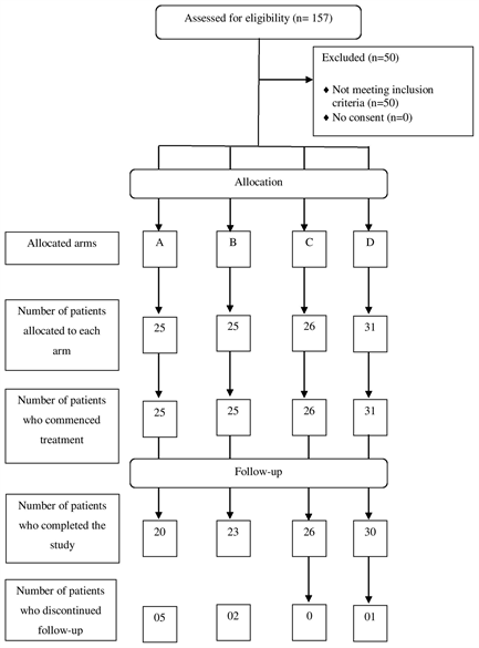 According to the calculation, a sample size of 100 patients in each arm was planned. During the trial, an interim analysis was done by an independent statistician to ascertain the adequacy of the sample because of logistic reasons using the same formula as above. Accordingly, a sample size of 25 patients in each arm was considered adequate and patient recruitment was stopped when that target was reached.
