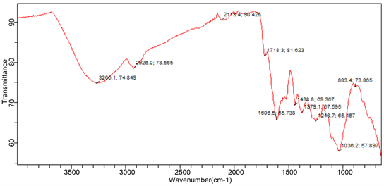 The content of Figure 4 and Figure 5 extracts based on the identified peaks in the IR spectrum shown in Figure 7 and Figure 8 are presented in Table 1 and Table 2, while the content of the Rothmannia whitfieldii fruit dry powder based on Figure 6 is presented in Table 3 below. The interpretation given to each peak is based on extensive work done by series of researchers in the field of IR spectroscopy [13] [14] [15] [16].