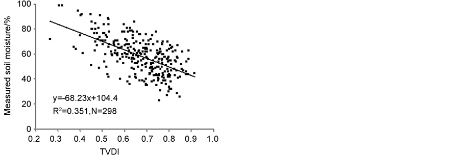 Using the IDL programming language, the LST-NDVI feature space is constructed by using MODIS surface temperature data and vegetation index data. It is very important to select the appropriate pixels in the image for the regression fitting in the process of fitting the wet and dry edges of the feature space. It is assumed that the maximum value of LST decreases with the increase of NDVI, and there is a linear relationship between them. But the truth is that NDVI and LST do not always have a linear relationship. The NDVI value is too high to estimate the vegetation coverage at the early stage of vegetation growth, while the vegetation coverage is too low at the later stage of vegetation growth. The dry and wet edges are extracted when the general limit NDVI between 0.20 - 0.80 [8] . Therefore, the maximum and minimum values of the surface temperature corresponding to the NDVI values of each pixel in the study area are extracted by programming. Based on the least squares method, the dry and wet side equations of the LST-NDVI feature space in the study area on march 28th, April 8th, May 5 and 28, 2012 (Table 1) were fitted. The TVDI index of the study area was calculated by using the equation of dry-wet edge and the formula (1). According to the latitude and longitude information of the measured site, the TVDI value can be extracted from the image to analyze the relationship between TVDI and soil moisture. (In Table 1, R2 is the correlation coefficient. It is calculated according to the equation).
