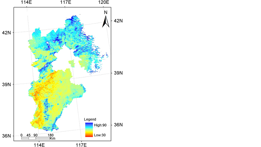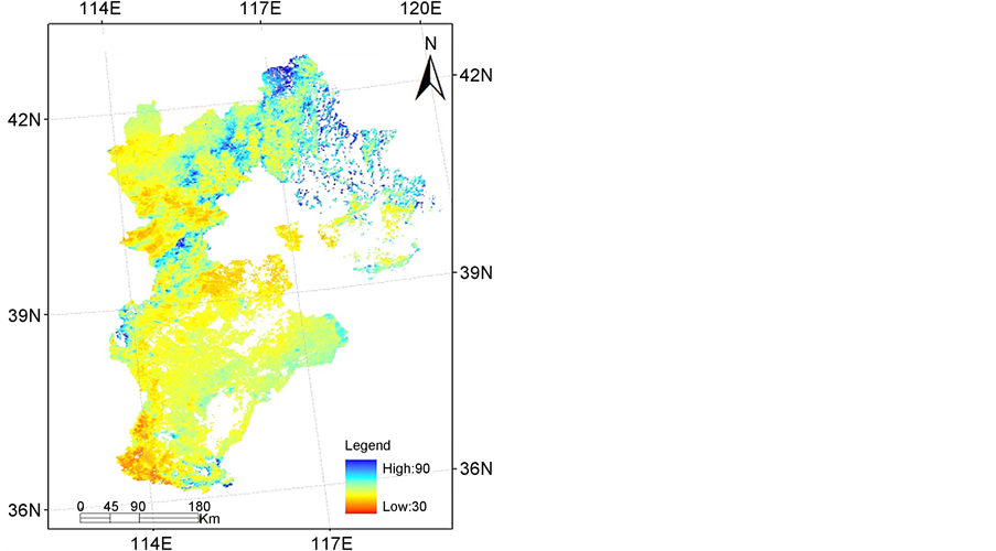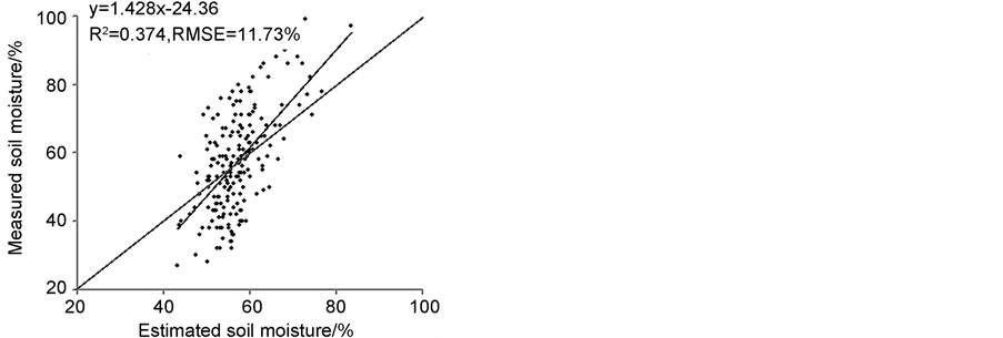 In order to further test the inversion effect of the TVDI index model, a series of data from Hebei Province (March 28 and April 18, 2011) was used to invert the soil moisture. It is important that models were evaluated accurately. Figure 2 is the inversion of the cross-validation with the measured data. From the distribution of the scattered points, most of the points are distributed near the line of y = x, which shows that the inversion of the 10 cm soil moisture and the measured 0 - 10 cm soil relative humidity have a good consistency. The correlation coefficient reached 0.374, and the square root error is 11.73%. The inversion model has a high accuracy of inversion from the correlation coefficient and root mean square error of the inversion results. Obviously, the soil moisture in different areas is different.