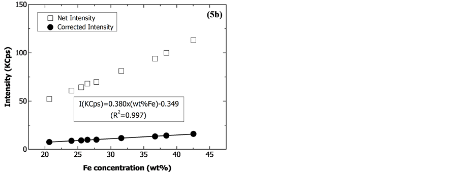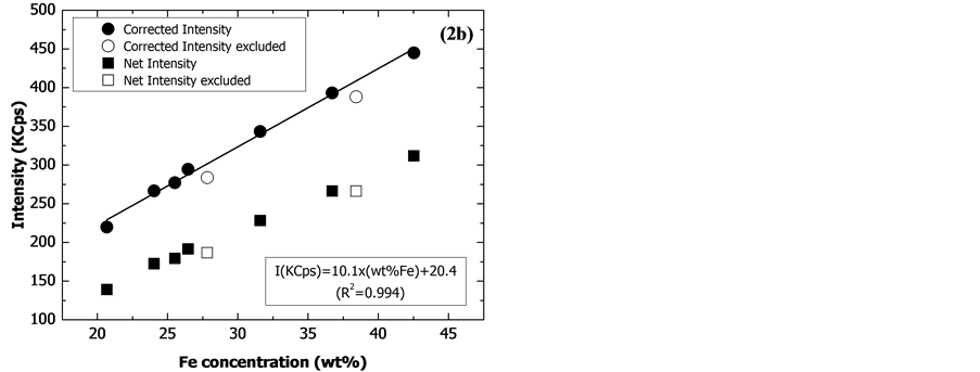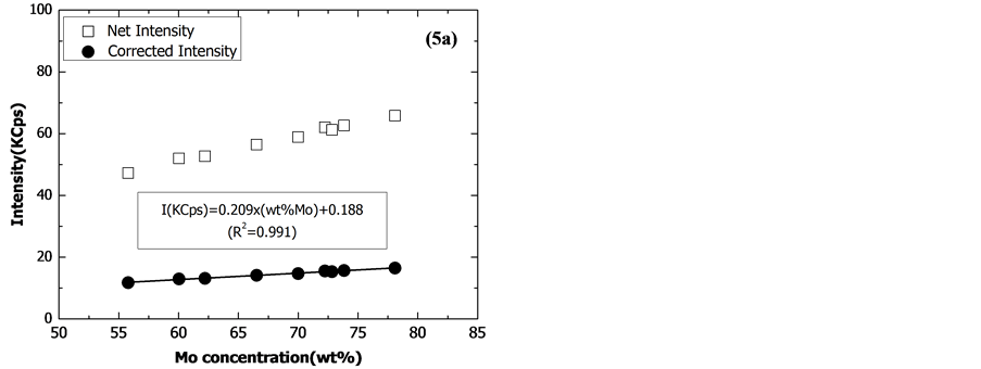 The nine calibration standards were fused into glass discs by lithium borate fusion technique, and the calibration curves of Mo and Fe were constructed as shown in Figure 5. Each calibration curve was obtained by applying matrix corrections with the help of variable alpha coefficient method and line overlap corrections. Both of them indicate good linear correlations between corrected X-ray intensity and concentrations of Mo and Fe for the investigated compositional range of each component. Therefore, it is believed that the nine standard materials in the form of fused glass disc can appropriately be applied to XRF calibration for the chemical analysis of FeMo alloys.