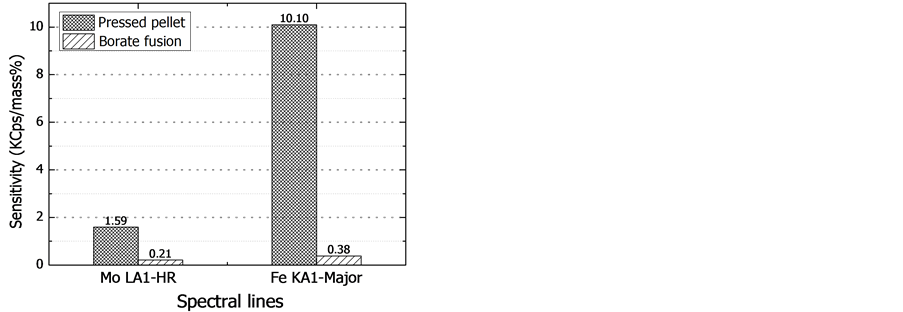 Figure 6. Comparison of the sensitivities of each spectral line (Mo and Fe) affected by sample preparation methods (Pressed pellet vs Borate fusion).
