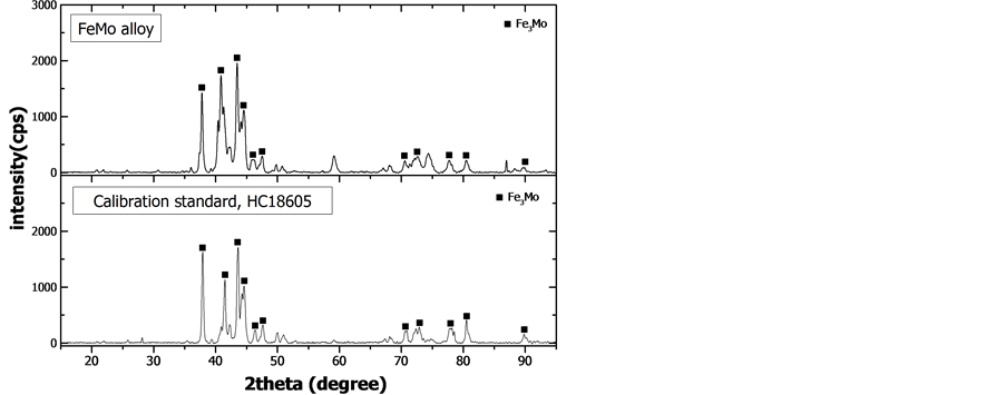 In most cases, X-ray fluorescence spectrometry analyzes the concentrations of cations or anions (e.g. Fe, Mo, etc.) and then converts them to those of compounds which are assumed to be most likely to exist in a sample. In order to identify the existing phases of Mo in FeMo alloys, X-ray diffraction analyses were performed for a FeMo alloy and a calibration (HC18605) as shown in Figure 1. The primary phase of Mo in both samples was estimated to be Fe3Mo. This indicates that the effect of Mo existing in different forms on the matrix correction in XRF analysis will be minimized in case the pelletized FeMo alloys and calibration standards are directly measured by XRF. Therefore, it is straightforward to deal with Mo content in FeMo alloys and calibration standards where Mo only exists in the form of Fe3Mo in the pressed pellet.