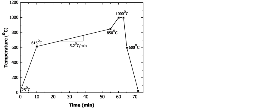 · As shown in Figure 3, the platinum crucible containing the flux, non-wetting agent, oxidizer and sample started to be heated up to 615˚C for 10 min and then the temperature was slowly raised up to 850˚C in O2-blowing atmosphere (1 l/min) for 45 min for ensuring the complete pre-oxidation of the sample.