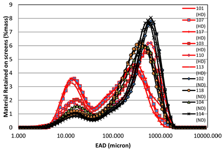 Figure 7. Percentage (%w/w) of the bimodal distribution which has a particle size range of 3 to 60 μm and 60 to 1000 μm. ( HD lines and ND lines.)
