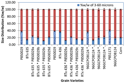 The PSD of sorghum flour samples shows that HD lines has greater portion of fine particles (about 3 to 60 μm) and lesser amount of coarse particles (about 60 to 1000 μm) than ND lines when hammer-milled using 1 mm screen openings. The physical characteristics of grain, such as kernel hardness and endosperm texture, have significant association with particle size distribution (r value = 0.424 and r value = −0.439). It could be deduced that HD grains break easily than the ND because HD RILs have soft and floury endosperm matrix. This is also supported by the LSD results in Table 9. HD parent has the smallest MMD (15.40 and 226.63 for 0 - 60 μm and 60 - 1000 μm) while ND offspring has the largest MMD (447 μm). Though MMD of HD offspring is not significantly different in with ND parent, the HD offspring has the significantly highest GSD, meaning with most variation of particle size among the digestible groups.