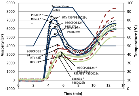 The study also calculated the breakdown and setback from the difference between the peak and trough viscosity and the final and trough viscosity, respectively. Due to large number of sample set, the study duplicated all runs and reported average values. The study described the flour pasting profiles.