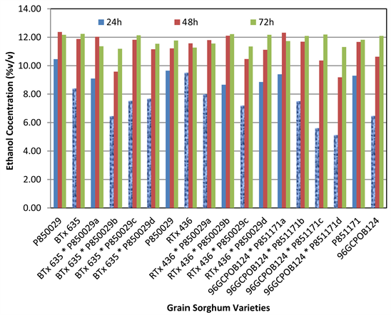 Sorghum breeders are working with thousands of sorghum genotypes with diverse genetic backgrounds, chemical, and physical properties. Most of the previous research on grain sorghum was focused on the digestibility of sorghum protein from the nutritional point of view [13] [14] [15] and [16] . Not much research has been conducted on the performance of sorghum varieties in ethanol fermentation in relation to the protein and starch digestibility of sorghum. By understanding and analyzing the relationship among the key factors impacting on the bio-processing of sorghum, the best sorghum genotypes with high conversion efficiency for ethanol production could be identified. This will assist the breeders in the development of new and improved sorghum hybrids for ethanol production and will increase the production and utilization of sorghum to meet the enormous feedstock demand of the future ethanol industry.