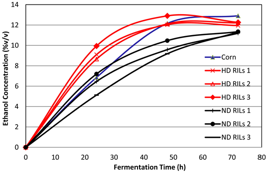 When HD lines were used, independent t-test at α = 0.05 shows that there is a significant difference in % ethanol yield between 24 and 48 h (50% and 65% ethanol yield, respectively) and no significant difference between 48 and 72 h (65% and 65% ethanol yield, respectively). However, when ND lines were utilized, significant increase in % ethanol yield can be observed until 72 h of SSF (38%, 58% and 62% ethanol yield at 24, 48 and 72 h SSF, respectively). Results only show that HD sorghum lines have faster rate of conversion and shorter reaction time needed to achieve completion than ND sorghum lines. Thus, HD lines have significantly higher % ethanol yield than the ND lines if fermentation time will be shortened to 48 h.