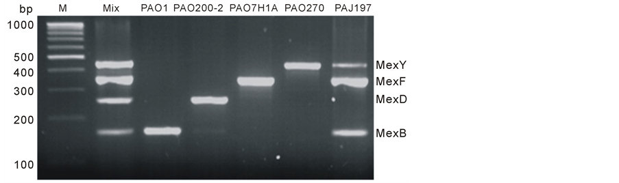 from all the reference strains was used for template, PCR amplicons of all 4 Mex systems was obtained (Figure 1) and DNA sequencing analyses confirmed their specificity. By using mRT-PCR, MexB, MexD, MexF and MexY expression was detected in PAO1, PAO200-2, PAO7H1A and PAO267, respectively. None of the Mex expression was observed in PAO200, PAO238, PAO255 and PAO280 that are null mutant derivatives.
