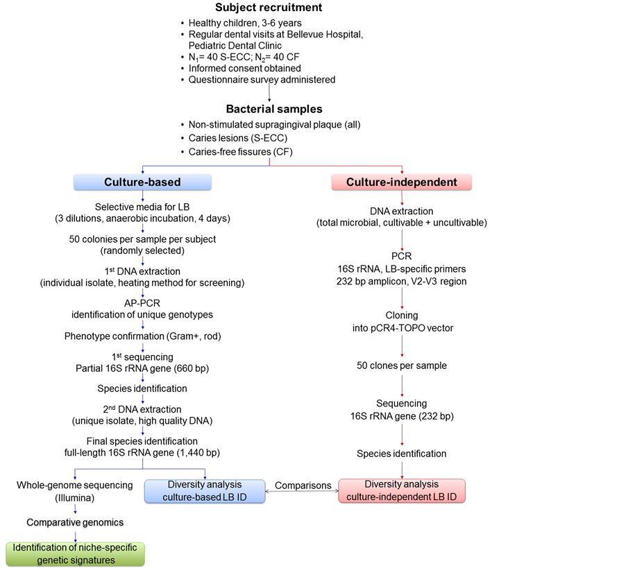 The study proposes a well-designed methodology aimed to assure that the sampling depth will be sufficient to find most Lactobacillus species associated with dental caries. Unlike most culture-based studies of the microbiota of S-ECC, this protocol utilizes a dual approach that utilizes both culture-based and culture-independent approaches. The culture-based component relies on a Lactobacillus selective medium that eliminates the background growth of other acid-tolerant oral bacteria, and can be completed, from sample plating to lactobacilli screening and isolation, in 10 to 12 working days for each subject. The workflow can be staggered for multiple subjects, allowing a trained team of dentists and lab technicians to process 5 - 10 subjects in one day. Lactobacillus strains isolated based on the selective medium can also serve as source materials for the whole genome sequencing and comparative genomics leading to the identification of niche-specific loci. The culture-inde- pendent component can be completed in 5 to 7 days from sample collection, genomic DNA purification to retrieval of the Lactobacillus 16S rRNA sequences for each subject. Up to 8 subjects can easily be processed simultaneously. Moreover, the culture-independent component relies on a new set of Lactobacillus-specific primers which allows for the detection of lactobacilli in plaque samples, even though they are present in low numbers. That all elements of the study will incorporate a custom-designed barcoding identification and tracking system and a user friendly interface will greatly enhance the efficiency and accuracy of samples process and data management.