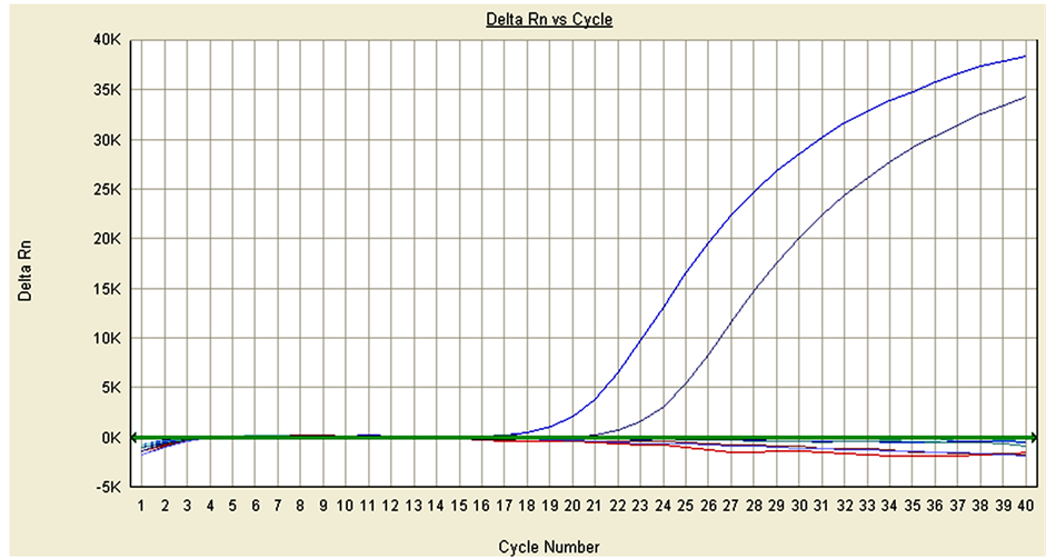 In the dual reaction, 2 µl of sample containing the DNA template was added to a 28-µl reaction mixture (Final concentration: dATP, dTTP, dGTP and dCTP 0.24 mM respectively; Mg2+ 2.4 mM; C-F and C-R 0.32 µM; C-2a-Prob and C-2b-Probe 5 µM; Taq1 U/µL; Taq protection 0.2 U/µL). The PCR reaction started with an initial denaturation and polymerase-activating step of 94˚C for 3 min, followed by 40 amplification cycles of a 3-step PCR (94˚C for 15 sec; 60˚C for 40 sec and detecting fluorescent light). Fluorescence channels are FAM and HEX.
