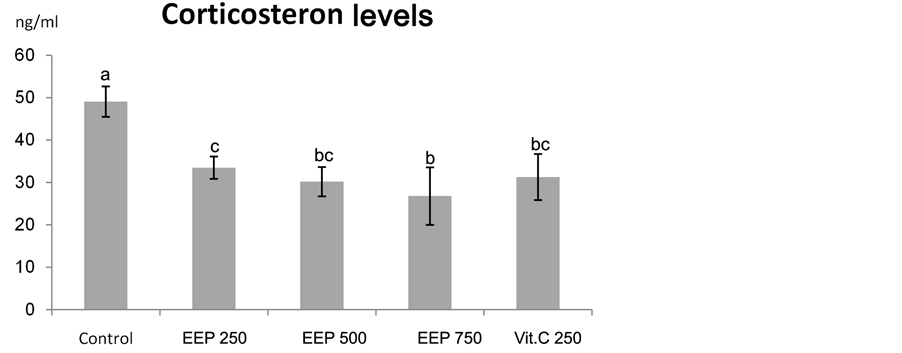 Figure 2. Effect of Chinese EEP (250, 500 and 750 mg/kg diet) and vit C (250 mg/kg diet) on corticosterone level in broilers exposed to heat stress. abc: means with different letters are significantly different (P < 0.05).