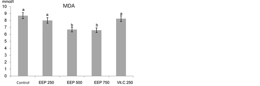 Oxidative stress is known as the main cause of balance disturbance between cellular metabolic antioxidant and oxidant [65] . Dietary supplementations of EEP and vit C to broilers (15 - 42 days) exposed to chronic heat stress led to increase in total antioxidant capacity (TAC) and decrease the activity of lipid peroxide (malondialdehyde, MDA) level (Figure 3(a) & Figure 3(b)). The highest and significant protective effect of EEP was achieved at concentrations of 250 and 500 mg/kg diet. However, higher concentration of EEP (750 mg/kg diet) and vit C (250 mg/kg diet) led to increase the TAC but not significantly. Meanwhile, the MDA resulted from heat stress was significantly ameliorated with EEP at concentrations of 500 and 750 mg/kg diet (P < 0.01). Non significant decrease in MDA level at 250 mg/kg diet for EEP or vit C was observed.