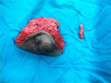 Figure 1. Resection of retroareolar breast tumor with safety margins marked by one stitch for the upper margin and two stitches for the medial margin with an extra-medial safety margin for more confirmation because the resection margin was near to the tumor.