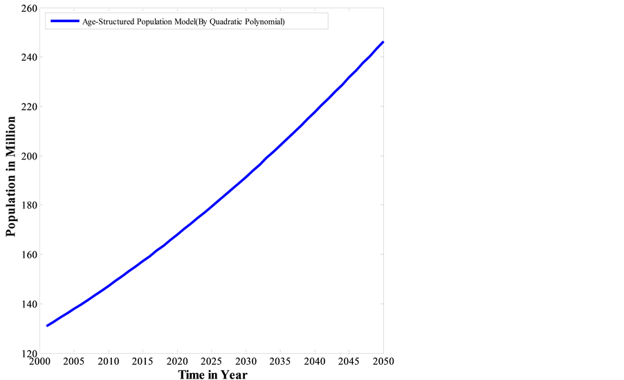 Figure 1 shows our estimated total population projection marked by “Age-Structured Population Model (By Quadratic Polynomial)” for the years 2001 to 2050. Here it is observed that the initial population in our model is 131 million for the year 2001 and the predicted population for the year 2050 is 246.3280 million. In the year 2021, in our model the predicted population will be 170.2044 million whereas the total population was 75 million in 1971. So the total population in 2021 will be 2.26 multiple of the total population of 1971.