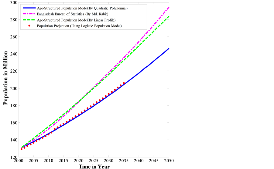 In 2035, in our model the predicted population will be 204.2385 million whereas the predicted population will be 235.67 million corresponding to the projection of BBS, 232.5276 million corresponding to the projection by Linear Equation and 205.979 million corresponding to the projection by Logistic Population Model. By Figure 2 one can observe that the inclination of the increasing population of our Age-Structured Population Model is more consistent than the demographical method of BBS and the population model by Linear Equation. From the comparison it is also observed that the prediction by the Quadratic Polynomial Curve Fitting method is much closer to the prediction by Logistic Population Model.