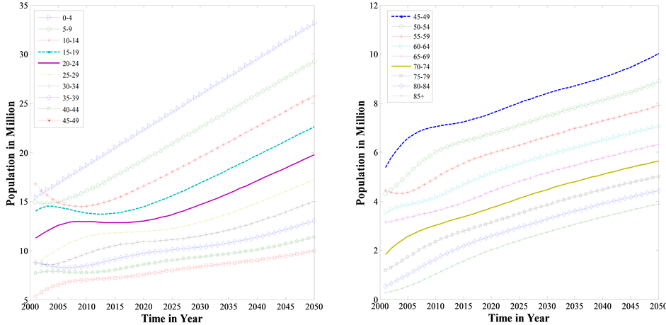 Figure 3 is showing the population projection for different age-groups of Bangladesh from the years 2001 to 2050. It is clearly observed that, the age of the people in the scale (0 - 15) will increase rapidly. The middle aged people will also increase but the increasing rate will be partially sloth and the increasing rate of aged people will be very sloth.
