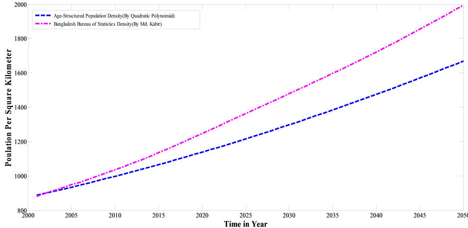 Figure 4 shows the comparison of our estimated population per-square kilometer projection marked by “Age- Structured Population Density (By Quadratic Polynomial)” with that of marked by “Bangladesh Bureau of Statistics Density (by Md. Kabir)” for the years 2001 to 2050. Here it is observed that the initial population per- square kilometer is 888 in 2001 in our projection whereas it is 881 according to the projection of BBS. It is also observed that, for the year 2050 our predicted population per-square kilometer is 1669, but it is 1995 according to BBS. In 2021, in our model the predicted population per-square kilometer will be 1153 whereas the predicted population per-square kilometer will be 1271 according to the projection of BBS.