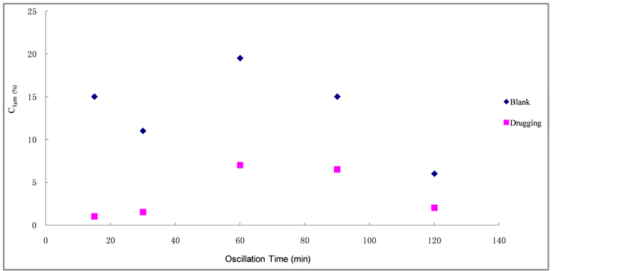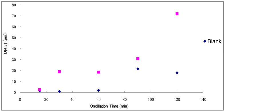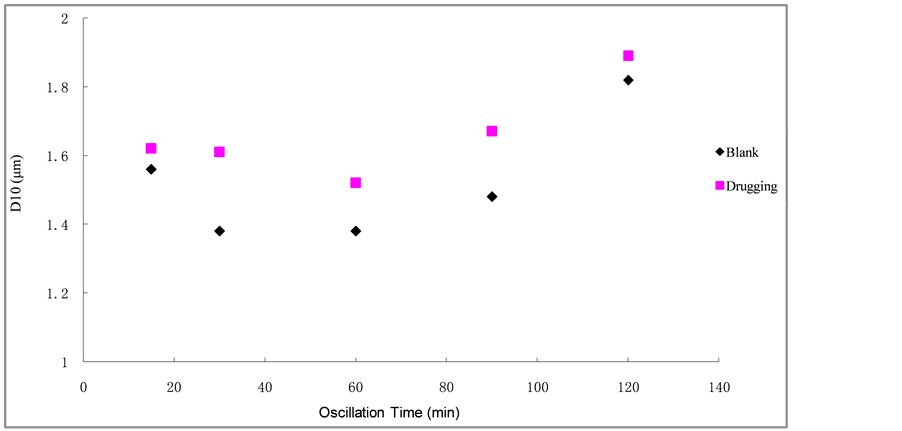 We can get from Table 3 and Figure 2, drugging can increase oil droplets which particle diameter under 1 μm (D10). With the increase of the oscillation time, D10 in blank sample and adding sample is all increasing. This is due to the increase of oscillation time, the oil droplets increase the chance of collision, lead to small oil droplets likely to coalescence together.