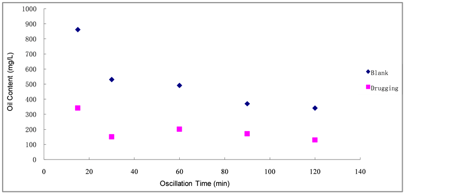To facilitate the evaluation, every oscillation time has two water samples, an adding sample, a blank sample. According to the experimental results of previous optimal selection reagent, the reagent in adding sample is S1, concentration is 20 mg/L. Experimental procedure: put two plastic bottles with simulated water sample in the 45˚C constant temperature water bath for 60 min, then add 1.6 g of oil particulate mother liquid and shake 20 times with hand. Of which one plastic bottle added S1 of 20 mg/L, making it as the adding sample, another bottle is the blank sample. Add about 8 g crude oil into both of bottles, then put bottles in vibrator shake in 360 r/min for 15 min. Set the vibrator in 45˚C incubator during shaking, to keep a constant temperature. After shaking, make bottles standing for 15 min, then measure the oil content and the distribution of oil particulate diameter in lower water. Change oscillation time. Repeat the same method. Oscillation time is respectively 30 min, 60 min, 90 min, 120 min [5] .
