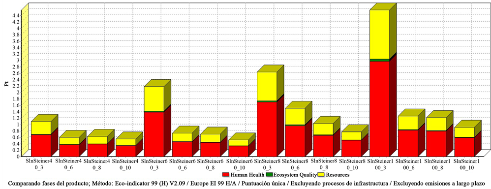 The lowest environmental impact showed in Table 3 was with a 60% Steiner solution concentration and an interval of 10 days of irrigation with a value of 0.5274 points. In Figure 1, comparison of each treatment was best seen. Concentrations of 40% and 60% showed the lowest values, so concentrations of 80% and 100% of