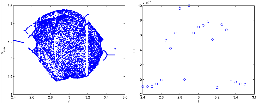 Figure 1. Bifurcation diagram and the LLE versus f for q = 0.95: (a) Bifurcation diagram; (b) The LLE.