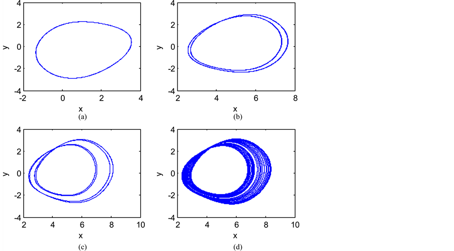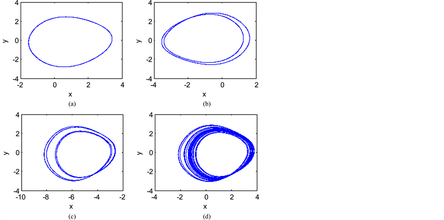 Figure 2. Phase portraits for different values of f: (a) f = 2.5; (b) f = 2.55; (c) f = 2.61; (d) f = 2.65.