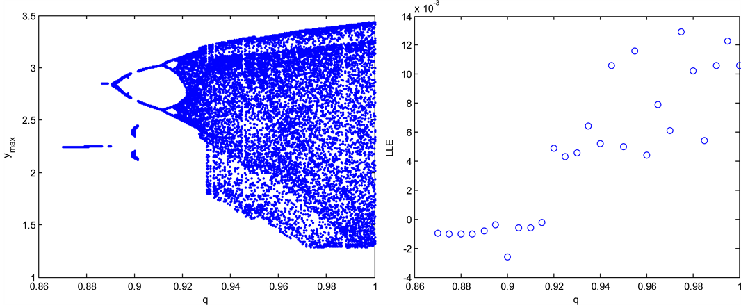 Figure 3. Bifurcation diagram and the LLE versus q for f = 2.8: (a) Bifurcation diagram; (b) The LLE.