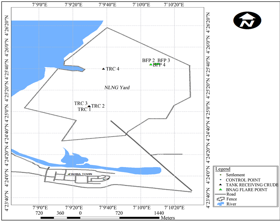 The study was carried out in Bonny Island, Bonny LGA, Rivers State. The study area was located between latitudes 4˚458'N and 4˚45'N, and longitudes between 7˚13'E and 7˚21'E (Figure 1). It contains the Bonny Terminal facility with coordinate location. The Bonny Island axis of the Niger Delta, Nigeria, is one of the most industrialized belts of Nigeria. Among the significant industries in the locality are the Bonny Oil and Gas Terminal. It comprises of crude and gas receiving facilities; treatment facilities; crude storage facilities; crude and gas export facilities and supporting facilities. The plant is one of Nigeria’s critical assets from which substantial amount of the nation’s crude oil export is affected. Bonny falls within the OML 11 oil block, which belongs to the Shell Petroleum Development Company (SPDC). The present Terminal occupies an area of 1,209,015 m2 and has a