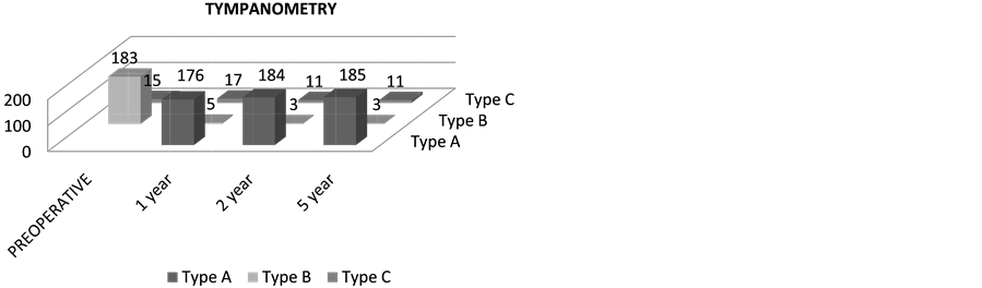 ET tympanometric tests were carried out in all patients at 1 year, 2nd and 5th year postoperative and compared to the preoperative data, we included 198 Eustachian tubes. Before Surgery we found 183 Type B Tympano- metries, after the first year 176 were Type A curves and for the 5th year 185 were Type A curves (Figure 4).