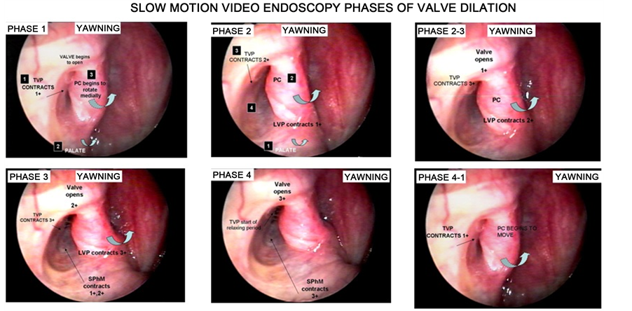 3) All patients underwent a trans-nasal endoscopic slow motion video analysis (SMVEA) of their Eustachian tubes, done with a 30˚ view angle using a rigid Hopkins rod endoscope measuring 4.0 mm or 2.7 mm diameter, (Karl Storz, Tuttinghem, Germany), recorded and analyzed on a S-VHS/SR-VCR in normal time, in slow motion and single frame viewing at 30 frames per second. Examinations were performed while the patient was awake and administered topical anesthesia by placing two or three cotton swabs soaked in a 2% Pontocaine solution and left for 5 to 7 minutes in the inferior meatus. The endoscopes were directed into the pharyngeal orifice while the patient remained sitting and rested his/her head in the chair’s headrest. The entire nose was first inspected and the 30˚ angle view was directed laterally. The ET medial structures and valve were examined. Subjects were asked to repeat the letter K, to swallow and to yawn for better viewing of the palate, medial cartilaginous lamina, tensor veli palatine muscle (TVPM), levatorveli palatine muscle (LVPM), sphenopharyngeousmuscle (SphM) and record valve dynamics in both normal and forced motion modes. Figure 1 shows the phases of valve dilation in a normal Eustachian tube valve.