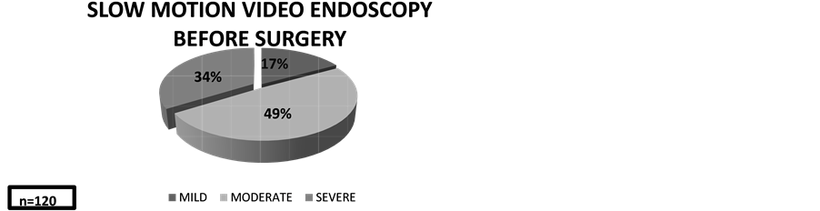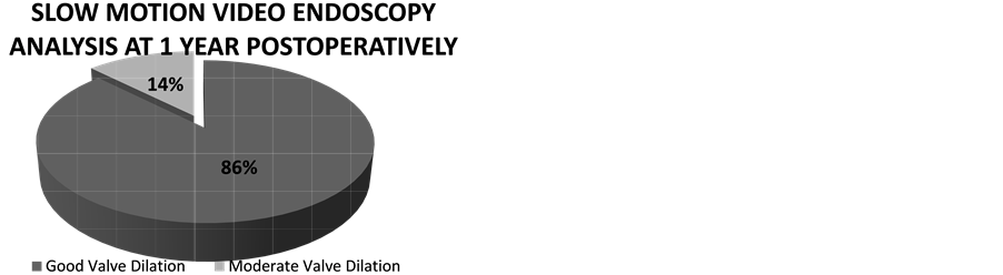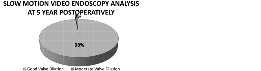 In the slow motion video endoscopy before surgery we found 49% of the patients with moderate impairment of valve aperture, and 51% between mild and severe impairment. At five years postoperatively, we can appreciate in 98% the improvement of valve dilation.