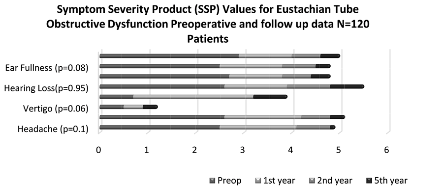 A symptom severity product (SSP) value was estimated for the 3-point scale symptom preoperatively, at one, two and five years postoperatively during follow-up and carefully compared. We observed how symptoms decrease during the follow up, being minimal at 5 years postoperatively (Figure 3).