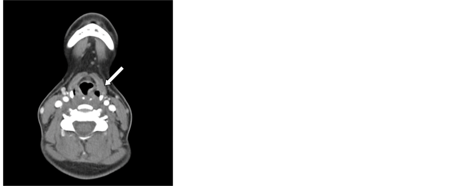 Figure 1. Axial CT with contrast at the level of the hypopharynx/supraglottis. Note the expansion of the left piriform sinus with air and medialization of the left aryepiglottic fold/false vocal fold (white arrow). CT evidence of VFP must not be confused with cervical neoplasms, arytenoid cartilage subluxation or fracture, or oblique imaging findings, all of which can mimic VFP.