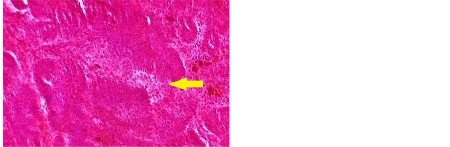 Figure 4. Showing cells arranged in nests and clusters with palisading of cells at the periphery and in a haphazard manner in the center. The cells showed hyperchromatic rounded nucleus with little or no cytoplasm (arrow).