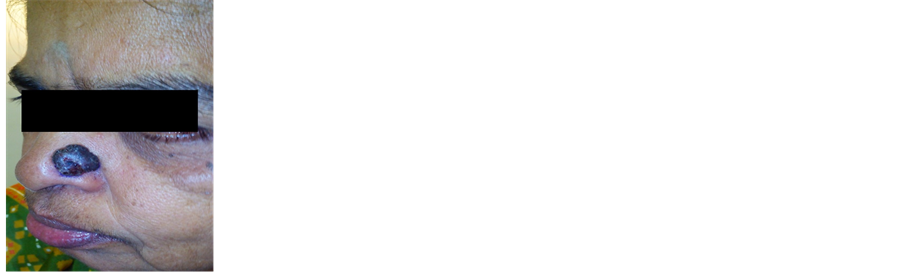 A 60-year-old female patient reported to ENT OPD with a complaint of blackish mass on the left side of nose. She noticed the swelling one year back initially small in size, gradually increasing in size over past one year to present size. It was occasionally associated with itching. There was no history of pain. Recently the patient had developed ulcer over the swelling and serous discharge which settled after application of topical cream as prescribed by local physician. There was history of continuous exposure of sun as patient worked in a field.