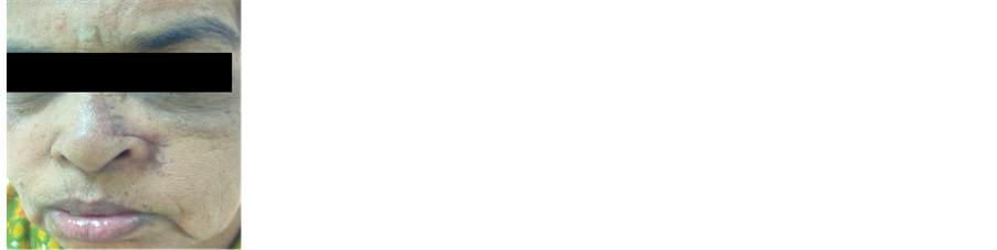 After detailed investigation, she was planned for excision biopsy under general anaesthesia. The tumour excision was done with 2 mm surgical margins with dissection plane superficial to perichondrium of lower lateral cartilage, thereby maintaining structural and functional integrity of ala. The resultant defect was primarily closed by local advancement flap by excision of suitable burrow triangles. Post operatively, she developed transient paraesthesia and tightness at the operated site which resolved by 6 weeks. Subsequently wound healed well with acceptable aesthetic outcome (Figure 3).