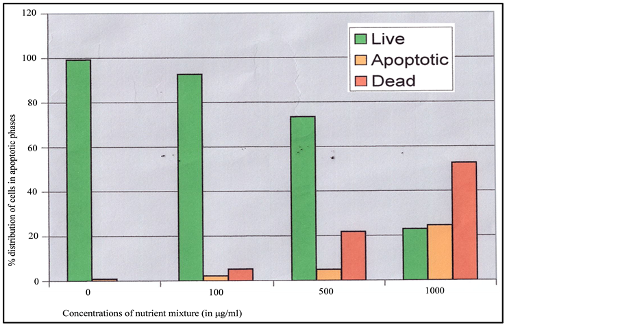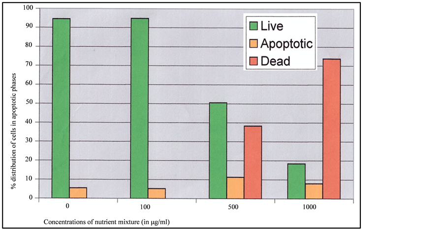 The DU-145 cells were stained by using H & E to detect apoptotic cells which show the characteristic morphological changes such as the shrinkage of the cytoplasm and darkly stained nuclei with intensely acidophilic cytoplasm. H & E staining of DU-145 cells treated with the nutrient formulation showed that with increasing concentrations of NM the cells showed extensive cell shrinkage, rounding and nuclear condensation (Figure 4). The changes were dose dependent, increasing in intensity with increasing NM concentrations.