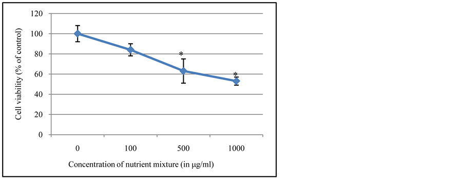 Cell viability was evaluated by MTT assay, a colorimetric assay based on the ability of viable cells to reduce a soluble yellow tetrazolium salt (3-[4,5-dimethylthiazol-2-yl]-2,5-diphenyltetrazolium bromide) to a blue formazan crystal by mitochondrial succinate dehydrogenase activity of viable cells. This test is a good index of mitochondrial activity and thus of cell viability. Briefly, cell suspensions were plated in 24-well tissue culture plates (Nunc, Denmark) at a concentration of 3 × 104 cells/well. After incubating the plates for 24 hours at 37˚C in a humidified incubator, the cells were treated with the nutrient mixture at concentrations of 100, 500 and 1000 μg/ml for 24 hours or left untreated in the control group. 500 μl of MTT assay reagent (Sigma No. M-2128-0.5 mg/ml in media) was added to each well followed by 2-hour incubation at 37˚C. Following incubation, the solution was carefully aspirated from the wells, the formazan product was dissolved in 1 ml DMSO and the absorbance (OD) was measured on a microplate reader at a wavelength of 570 nm in BioSpec 1601, Shimadzu spectrometer. The OD570 of the DMSO solution in each well was considered to be proportional to the number of cells. The OD570 of the control (treatment without supplement) was considered to be 100%.