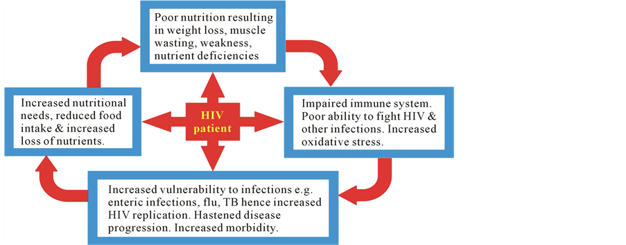 An earlier review by Piwoz and Preble [21] examined preliminary evidence that improving nutrition status may improve some HIV-related outcomes. HIV infection increases energy requirements through increases in resting energy expenditure (REE 12% higher), while reduced food intake, nutrient mal-absorption, negative nitrogen balance and metabolic alterations exacerbate weight loss and wasting, perpetuating the cycle [22] -[25] . Increase in REE may be due to the production of tumor necrosis factor—alpha and/or interleukin l in patients with AIDS. However, potential mechanisms of wasting invoked in AIDS patients and their impact on energy intakes (e.g., severe oral and/or esophageal candidiasis, viral esophagitis or extensive oral kaposis sarcoma) are