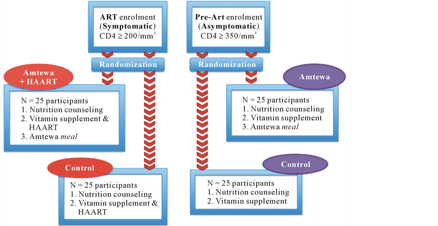This pilot study described 100 PLWH out-patients (>18 years) that were divided into four groups of 25 each (see Figure 2). 59% were female while 41% were male. 55% were married, 34% single, 7% widow and 4% widower. Fifty (50) of this PLWH were monitored for their adherence to ART and Amtewa meal (354.92 kcal per day) intervention versus their control (n = 50) for the duration of three and six months from April 2011 to December, 2011.