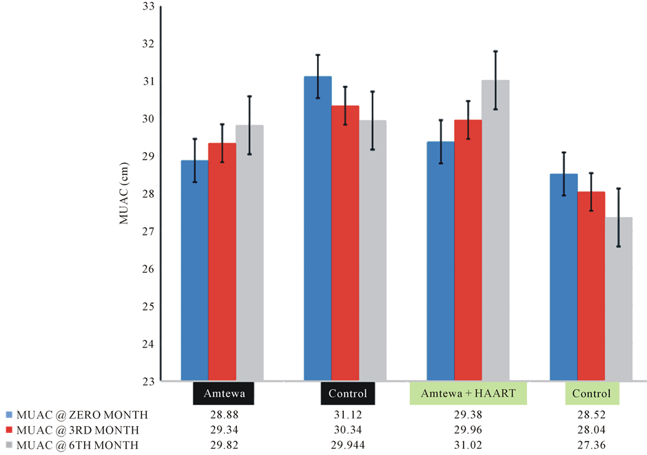 Median and Mean MUAC in Pre-ART and ART Test groups (i.e. with Amtewa meal) increased by 3.25% and 5.58% respectively (Figure 3). This is supported by Chlebowski et al. [37] and Suttmann et al., [38] , who demonstrated a 4 and 3 kg gain in body weight of HIV patients who received nutritional support. Additionally, it has been reported that employing fish oil and fish oil-enriched arginine, HIV patients gained between 1 and 2 Kg fat mass and body weight respectively over a six month period of nutritional support [39] .