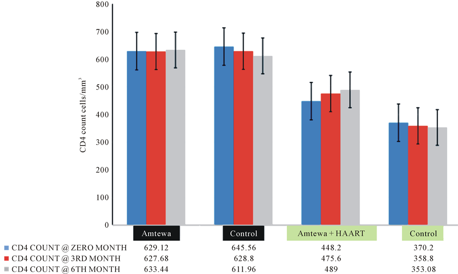 Figure 4. Bar chart showing the impact of Amtewa meal on CD4 (count cell/mm3) of study patients (n = 100).