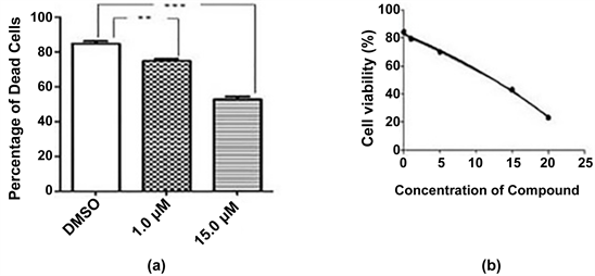 Figure 2. (a) Cytotoxic effects of compound on vero cell line after 24 hour incubation. Results are compared with vehicle (DMSO). The results are expressed as mean ± SEM (n = 3). Degrees of significance determined using ANOVA with Post Hoc Tukey’s test for comparison of isolated pure compound with vehicle are ***P < 0.001 and 0.01. (b) IC50 value of compound on vero cell line.