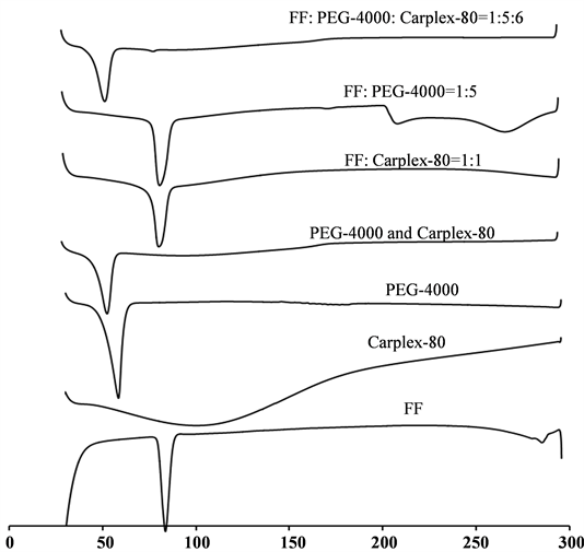 Two narrow endothermic peaks corresponding to that of FF (84˚C) could be observed with low intensity by SDF1 and SDF6, indicating minor changes in crystalline behaviour of FF. However, no peak for FF could be observed in the thermogram of SDF7 except for the mixed carrier, signifying that FF might be completely transformed into amorphous state.