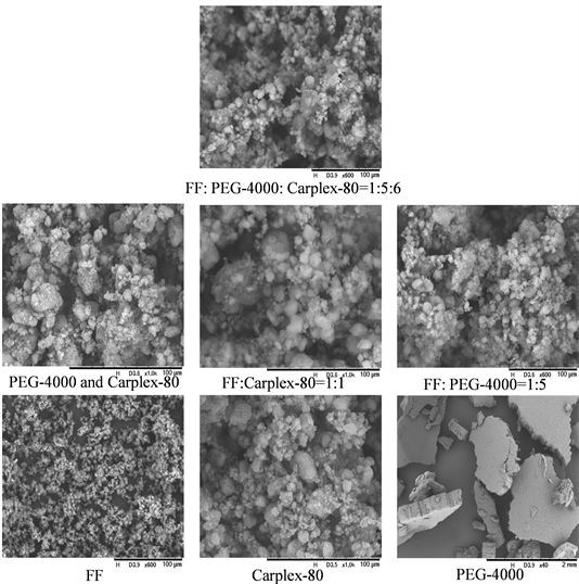Figure 5. SEM images of pure FF, Carplex-80, PEG-4000, mixture of PEG-4000 and Carplex-80, SDF-1 (FF: Carplex-80 = 1:1), SDF-6(FF: PEG-4000 = 1:5), and SDF-7 (FF: PEG-4000: Carplex-80 = 1:5:6).