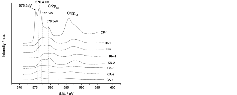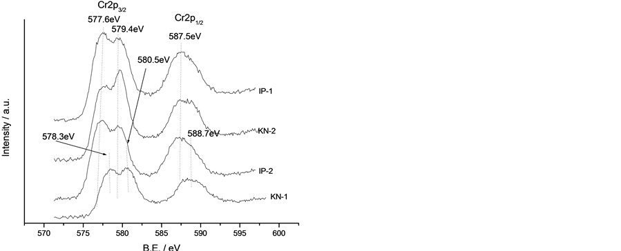 The XPS spectra of Cr2p (Figure 2) demonstrated that in all of the catalysts, Cr2p3/2 had two main peaks at 577.5 eV and 579.4 eV, which correspond to the binding energy of Cr3+ and Cr6+, respectively [18] -[20] . For the sample containing pure chromium hemitrioxide (CP-1), Cr2p3/2 had three peaks at 575.2 eV, 576.4 eV, and 579.3 eV. The first peak at 575.2 eV may represent the binding energy of Cr3+, and the binding energy of pure chromium hemitrioxide was lower in CP-1 than in other catalysts, indicating that the Cr-Al interaction affects the state of chromium. The XPS spectra of the samples prepared using the kneading molding and impregnation methods showed that the preparation method influenced the state of chromium (Figure 2(b)). The content of Cr6+ in the samples KN-1 and KN-2 was more than that in the IP-1 and IP-2 samples, and the peak gradually shifted from 579.4 eV to 580.5 eV. In addition, while comparing the Cr2p XPS spectra of KN-1 with that of KN-2 and the Cr2p XPS spectra of IP-1 with that of IP-2, we observed that the raw material used for the preparation of different samples altered the state of chromium. The intensity of the second peak was stronger for the samples KN-1 and IP-1 than for the samples KN-2 and IP-2.This finding demonstrated that the Cr-Al interaction was stronger in KN-1 and IP-1. For the CA-1,CA-2, and CA-3 samples (Figure 2(c)), prepared by physically mixing different raw materials, the major state of chromium was Cr3+ and some amount of Cr6+, and the amount of Cr6+ increased in the following order: CA-1 < CA-2 < CA-3. This result revealed that the preparation method and raw materials have a considerable effect on the state of chromium.