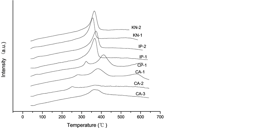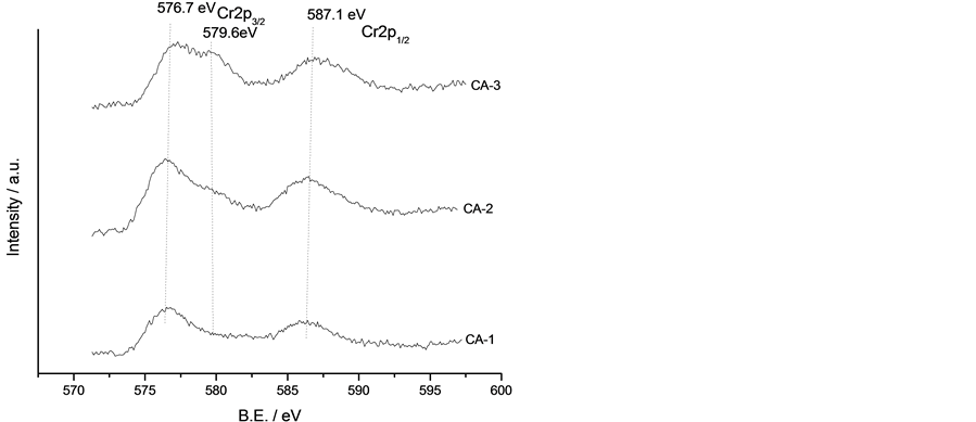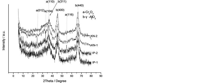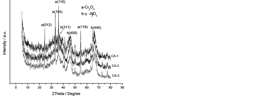 caused by the reduction of Cr6+ to Cr3+ [18] , which may be attributable to the reduction of free-form CrO3 and bulk CrO3. For the CA-1 and CA-2 samples, two reduction peaks were observed at 280˚C and 380˚C for CA-1 and at 250˚C and 360˚C for CA-2, and the intensity decreased as follows: CP-1 > CA-1 > CA-2. For the CA-3 sample, a single reduction peak was observed at 370˚C. These results suggest that in the aforementioned catalysts, CrO3 was dispersed on the surface of the catalyst and had some interaction with the bulk phase of the catalysts, which effect of strength is lower than the bulk phase of CrO3 but higher than the free form surface CrO3. When comparing the peak intensity of KN-1, KN-2, IP-1, and IP-2 with that of CA-1, CA-2, and CA-3, we discovered that the content of CrO3 was considerably higher in KN-1, KN-2, IP-1, and IP-2 than in CA-1, CA-2, and CA-3. The contact surface for CA-1, CA-2, and CA-3 was considerably more than that for KN-1, KN-2, IP-1, and IP-2 because the chromium salts in CA-1, CA-2, and CA-3existed in molecular form in the solution. Thus, the contact surface had the most effect on the dispersion of CrOx species on the catalyst and the Cr-Al interaction. TPR results demonstrated that all the samples contained CrO3, and these results were consistent with the XPS results, and their amounts increased as the Cr-Al interaction increased. The XPS and TPR results revealed that the method of preparation of the catalysts altered the dispersion of CrOx species on the catalysts and the Cr-Al interaction in the catalysts.