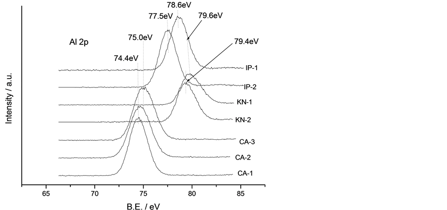 The XPS spectra of Al2p (Figure 3) for the CA-1, CA-2, and CA-3 samples revealed that the binding energy gradually shifted from 74.4 eV to 75.0 eV; this result was consistent with that of Cr2p. The samples prepared using the kneading molding and impregnation methods showed differences in the binding energy and the peak gradually shifted from 77.5 eV to 79.6 eV in the following order: IP-2 < IP-1 < KN-2 < KN-1. For example, the peak of KN-1 shifted to 79.6 eV. Thus, the Cr-Al interaction altered the state of both chromium and aluminum; these results were consistent with those of our previous study [18] .